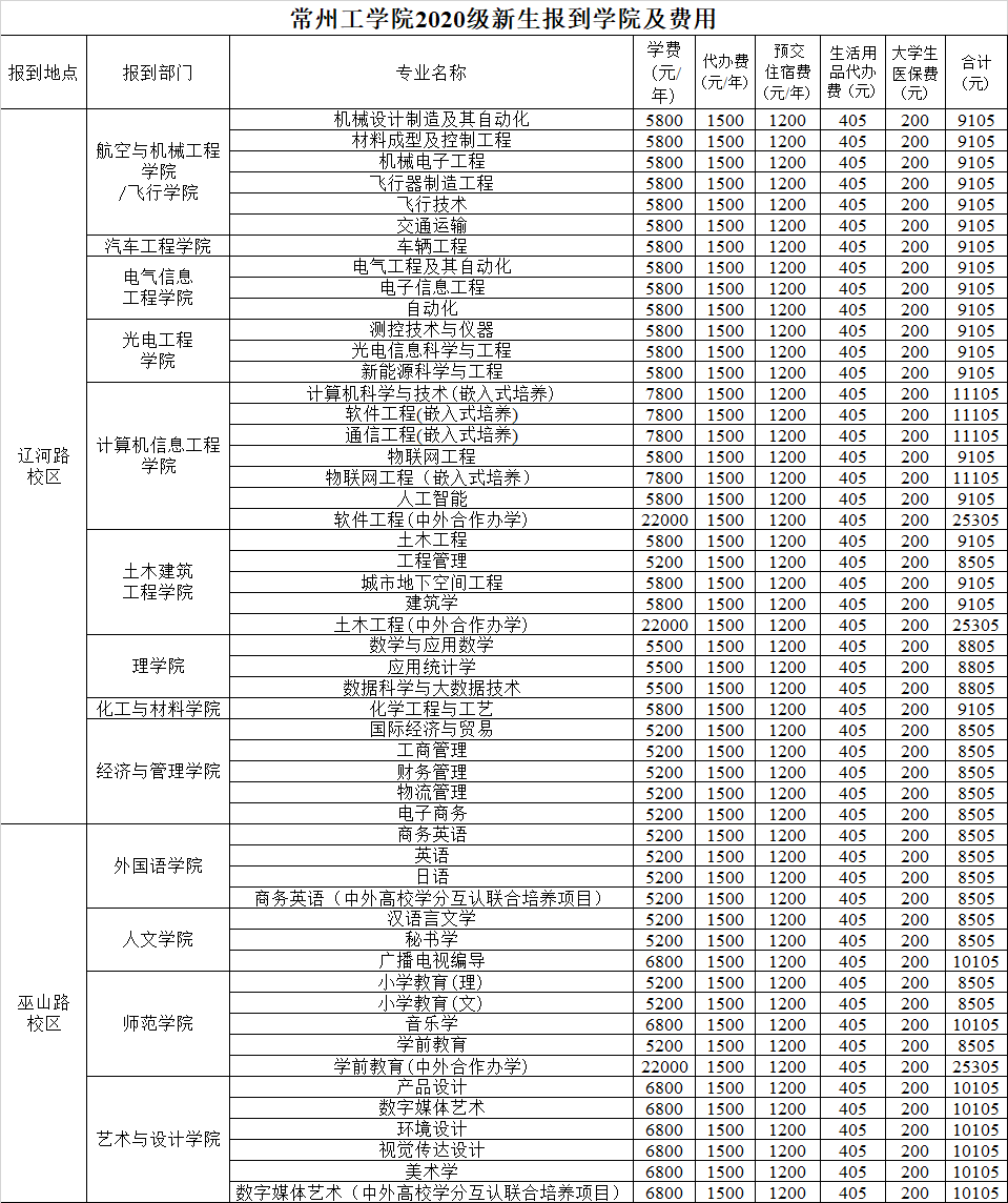 附:2020级新生报到部门及费用