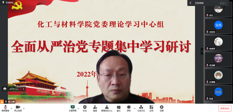 12月21日,化工与材料公司党委理论学习中心组通过视频会议方式开展全面从严治党专题学习研讨会。会议由公司党委书记储云峰主持,党委理论学习中心组(扩大)成员参加会议。
