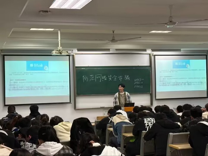 为深入开展校园防诈宣传,3月22日晚,22级全体员工在天枢楼参加防范电信网络诈骗教育宣讲会。