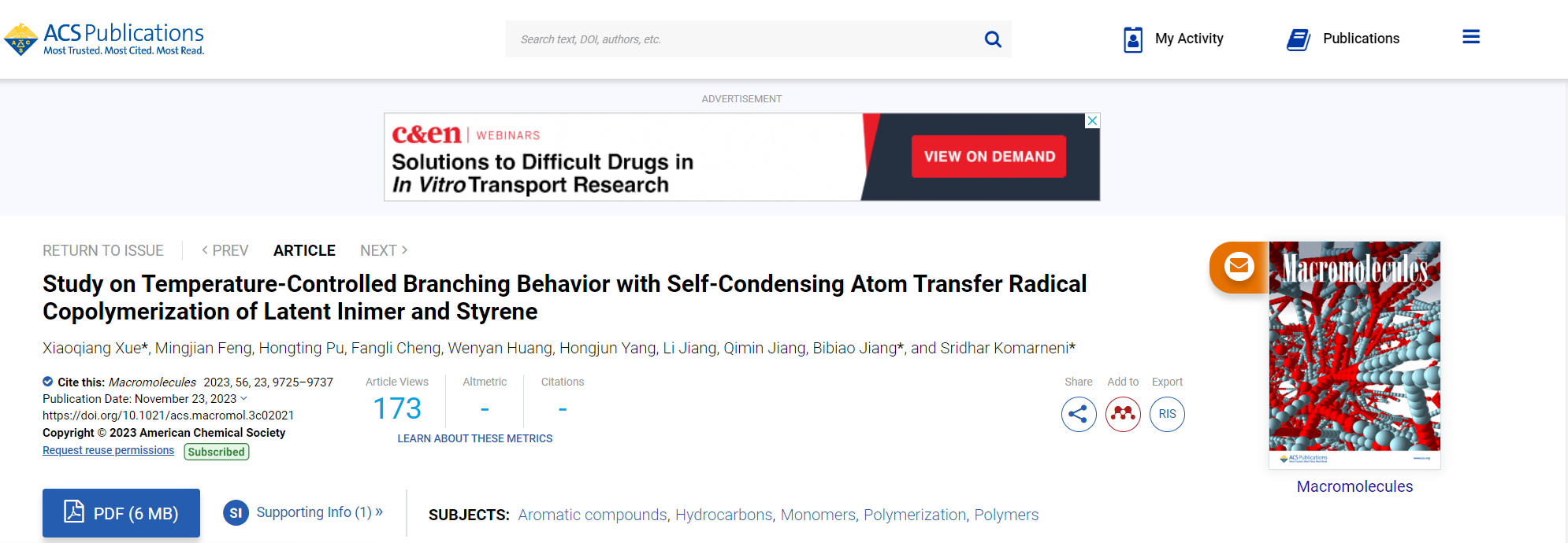 近日,tyc33455cc/碳纤维新材料产业公司绿色低碳高分子复合材料团队在高分子化学领域取得了重要进展。相关成果以《Study on Temperature-Controlled Branching Behavior with Self-Condensing Atom Transfer Radical Copolymerization of Latent Inimer and Styrene》为题发表在《Macromolecules》上(2023, 56, 23, 9725-9737),公司为第一单位。