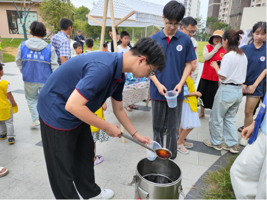尽管天气炎热,但志愿者和小朋友们依旧活力满满地手提酸梅汤,将这份清凉与关怀亲手送到一线户外工作人员的手中。大家纷纷对志愿者表示感谢,一份份酸梅汤如同夏日的微风,轻轻吹散了劳动者们的疲惫与炎热。
