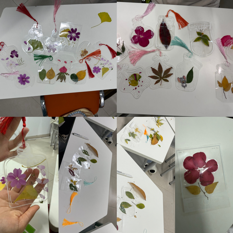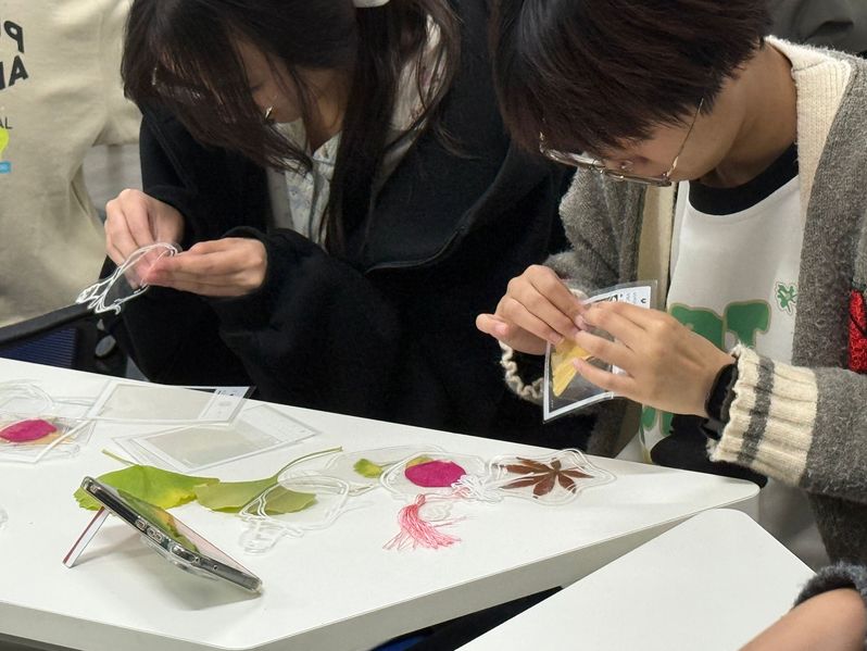 活动伊始,员工互相展示、交换在校园内收集到的落叶、花瓣等材料。随后,工作人员为员工分发手工制作材料并播放视频教程。制作过程中,员工充分发挥创意与想象力,将不同形状、颜色的落叶和花瓣巧妙组合,创作出了许多别具一格的落叶和花瓣书签。现场氛围轻松愉悦,同学们不仅释放了压力,收获了亲手制作的作品,更收获了专注的快乐、创作的成就感,以及彼此陪伴的温暖。